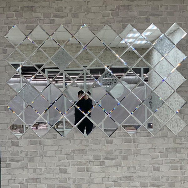 Зеркальное панно из квадратной плитки 18х18 удивительно гармонично смотрится в светлом интерьере на обоях под кирпич.